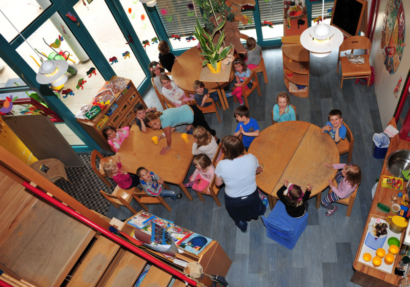 Die Architektur des Kindergartens ist sehr offen und gibt direkte Verbindungen zwischen den jeweiligen Nachbargruppen über eine gemeinsamen Intensivraum und den Waschraum. Über die Galerie im ersten Stock sind alle vier Gruppen miteinander verbunden. Die Kinder können und dürfen im ganzen Haus unterwegs sein. Besuche untereinander sind selbstverständlich.
