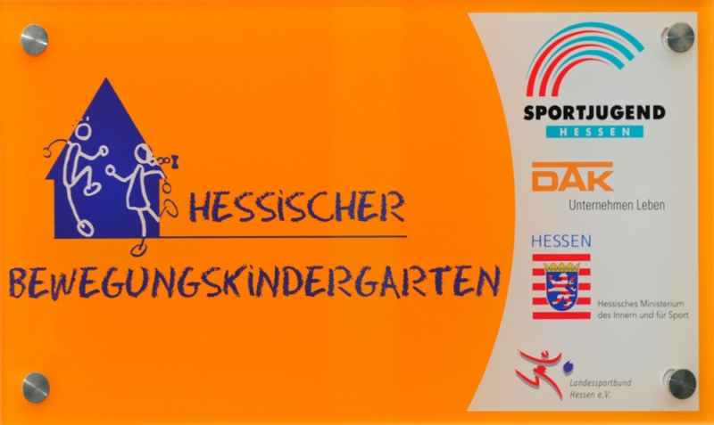 Der Sportkindergarten ist mit dem Qualitätssiegel „Hessischer Bewegungskindergarten" ausgezeichnet. Das Qualitätssiegel wird von der Initiative „Mehr Bewegung in den Kindergarten" der Sportjugend Hessen an Einrichtungen vergeben, die ‐ ganz im Sinne des Hessischen Bildungs- und Erziehungsplans ‐ dem Thema Bewegungsförderung einen besonders hohen Stellenwert einräumen und für eine hohe Umsetzungsqualität sorgen.
