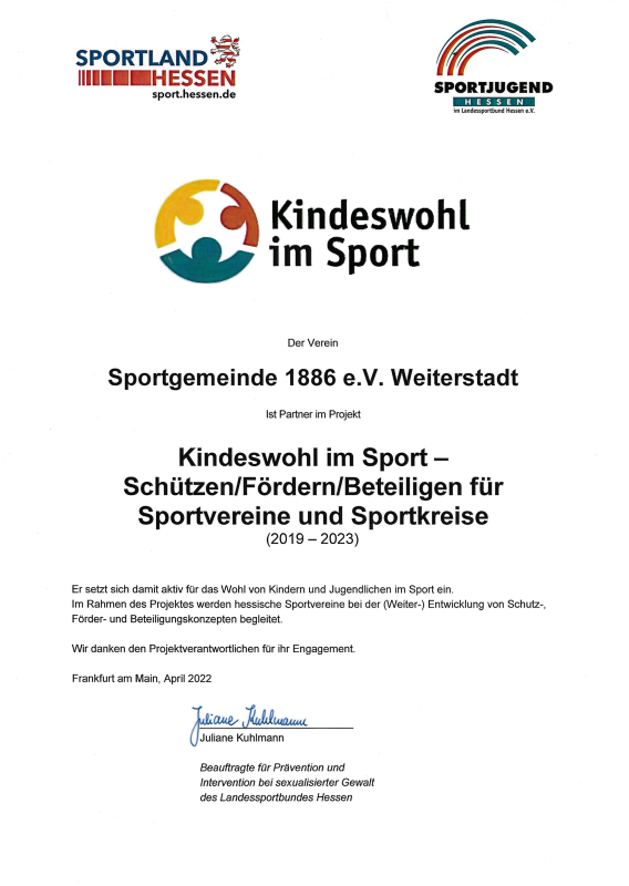Zudem ist die Sportgemeinde seit 2023 Gründungsmitglied im Bündnis "Safe Kids", dieses setzt sich mit seinen Partnern dafür ein, Schutz, Förderung und Beteiligung von Kindern und Jugendlichen im Sport langfristig, nachhaltig und flächendeckend in Hessen zu verankern. Jeglicher Formen von Gewalt im Sport gilt es wirksam vorzubeugen und zu bekämpfen. Im Rahmen regelmößiger Bündnstreffen und Weiterbildungen werden die Konzepte fortgeschrieben.